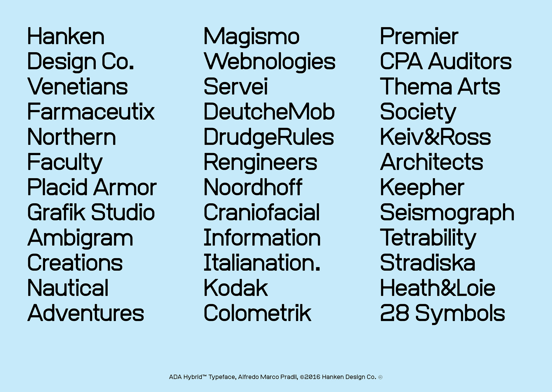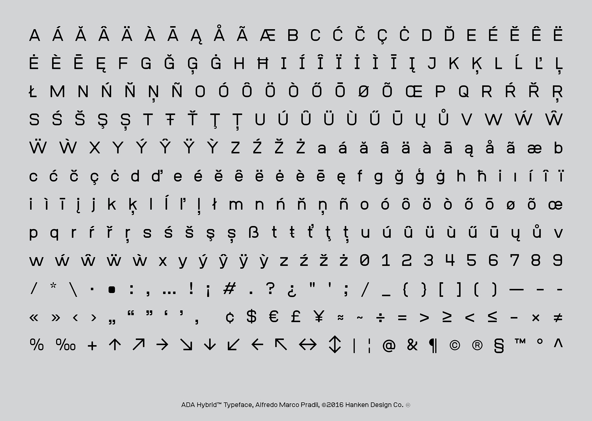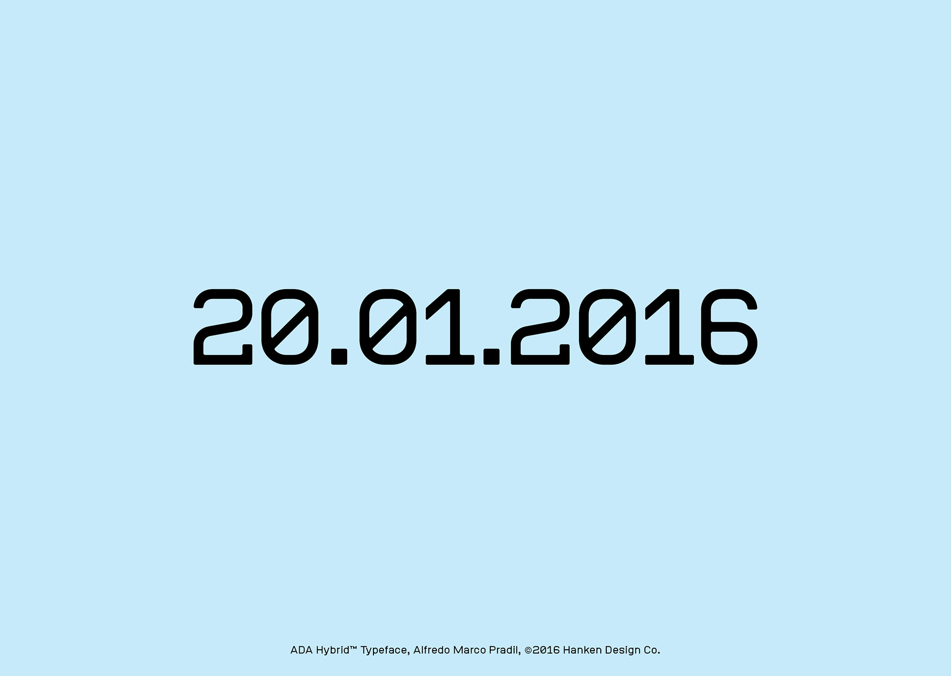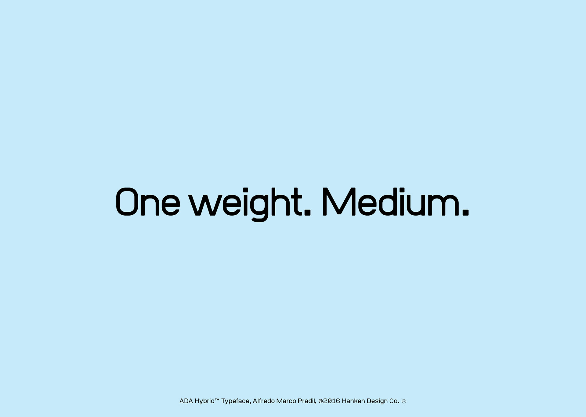 ADA Hybrid™ is a display typeface drawn without linear contrast and a combination of square and round glyphs. The combination of shapes and the discipline to not optically adjust the forms resulted in a typeface with character—a face that may take on different personalities but not being neutral in our current culture's perception. ADA Hybrid has been used for posters and user interfaces because of the legible characters.