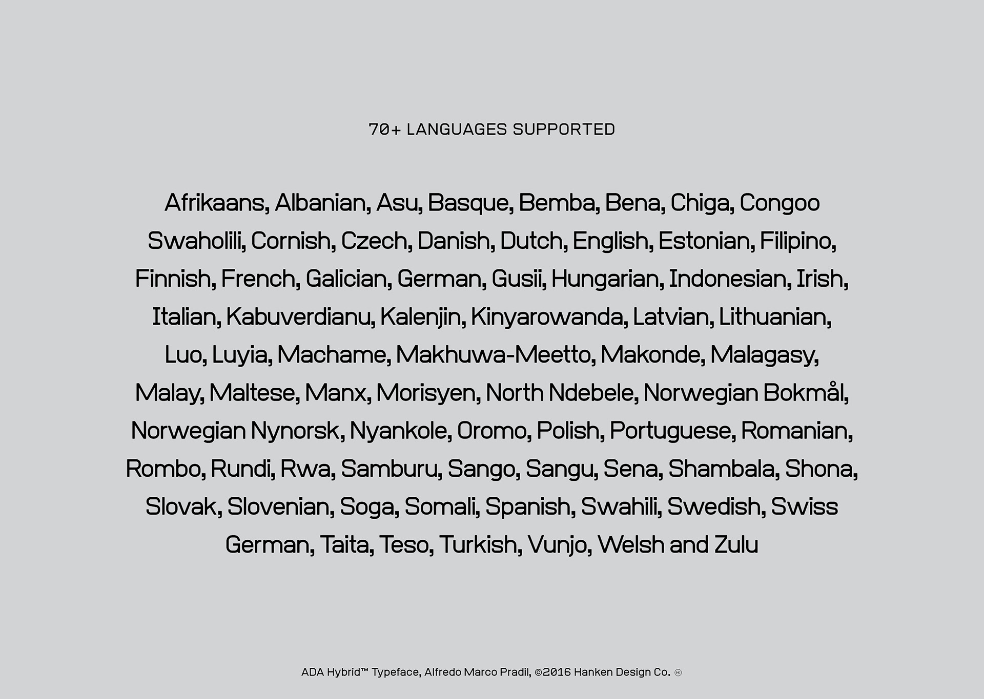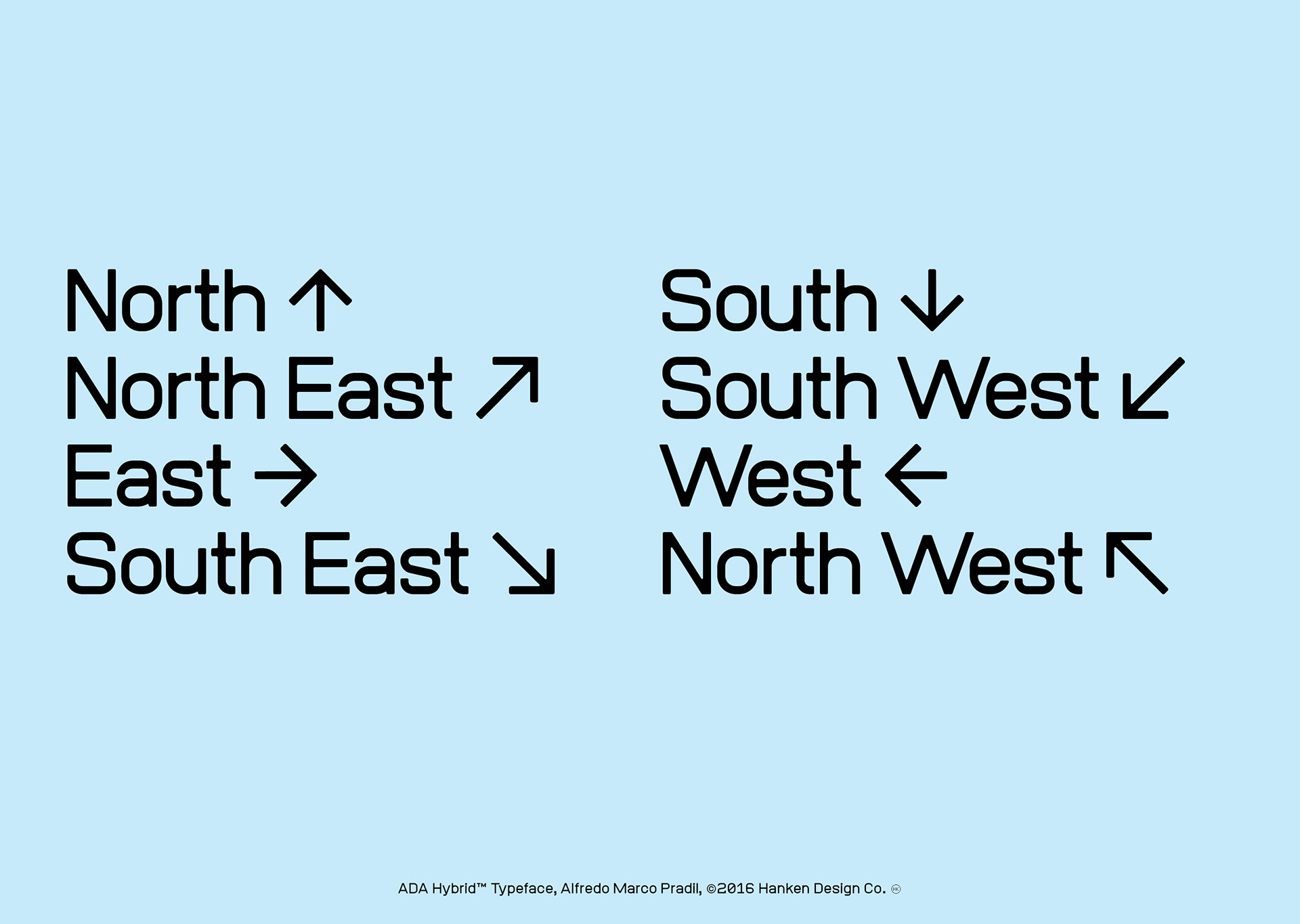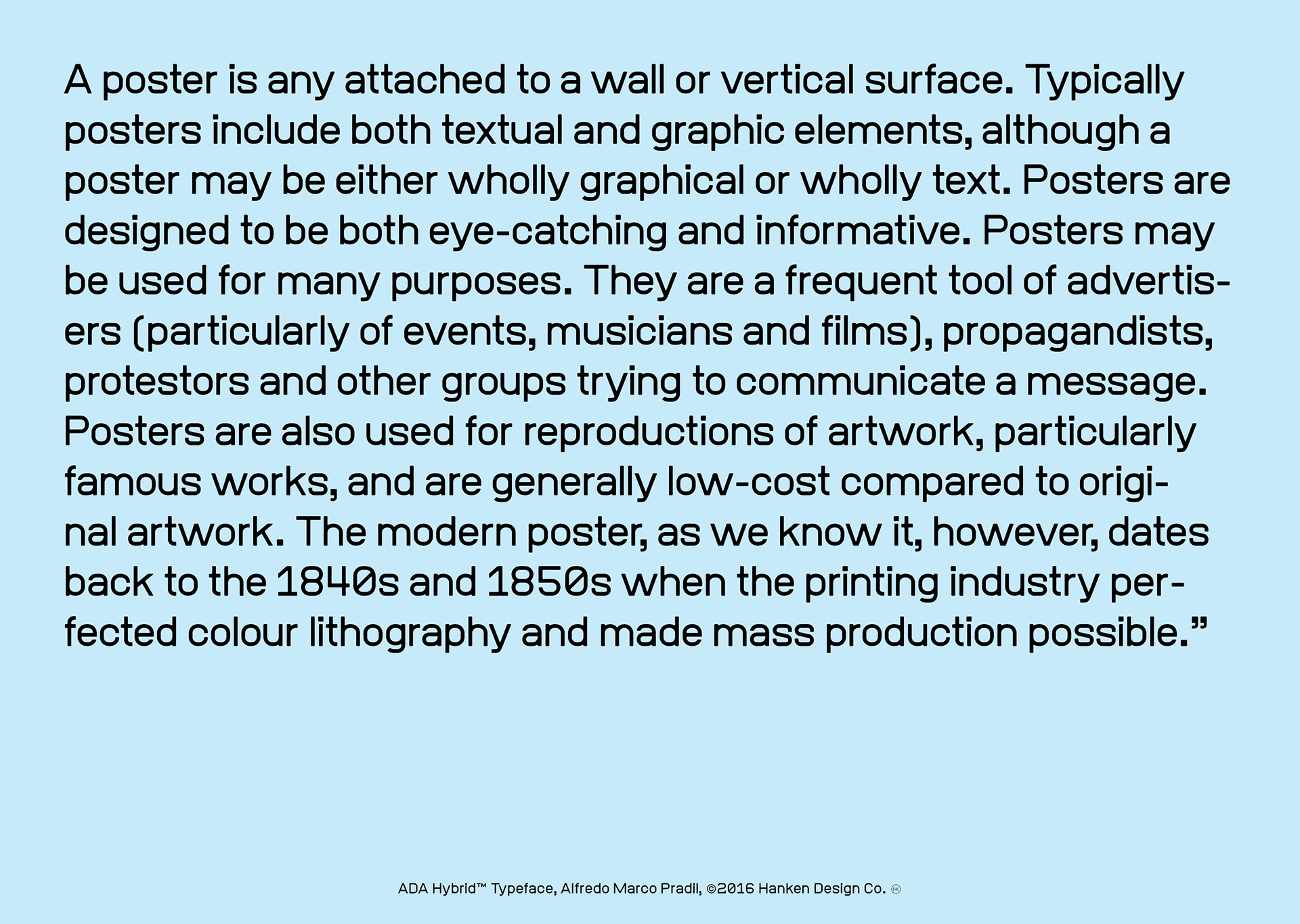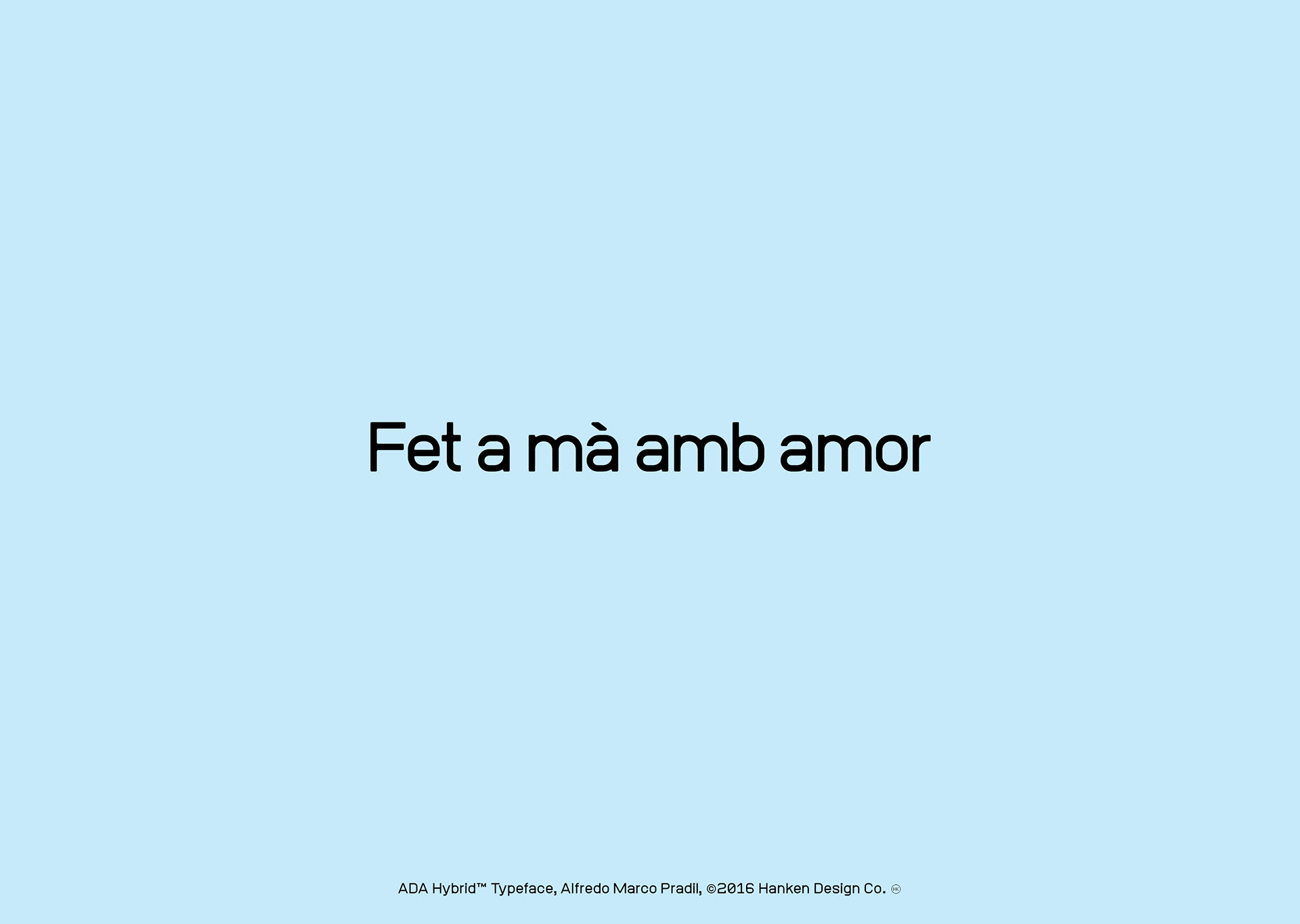 ADA Hybrid™ is a display typeface drawn without linear contrast and a combination of square and round glyphs. The combination of shapes and the discipline to not optically adjust the forms resulted in a typeface with character—a face that may take on different personalities but not being neutral in our current culture's perception. ADA Hybrid has been used for posters and user interfaces because of the legible characters.