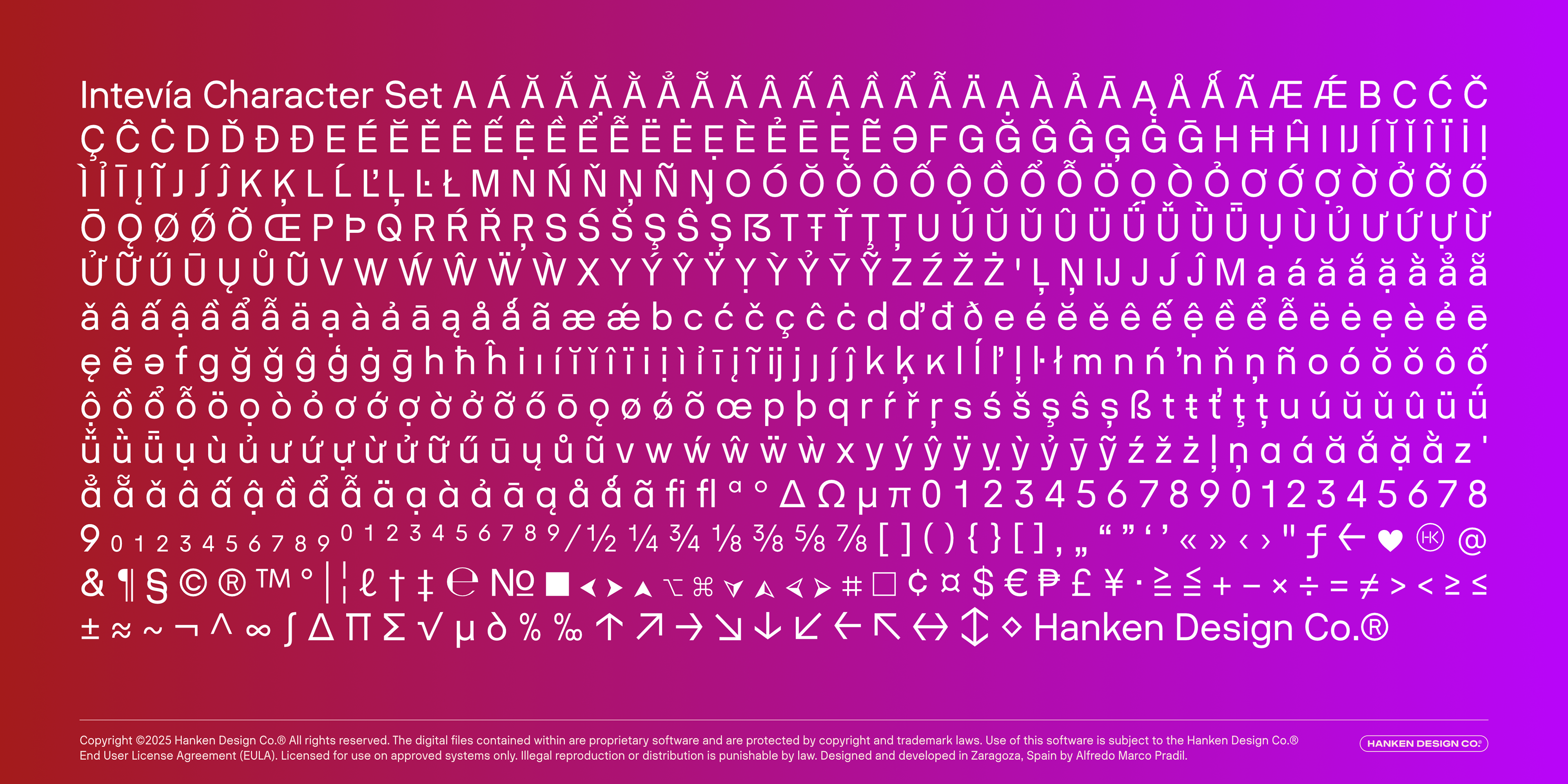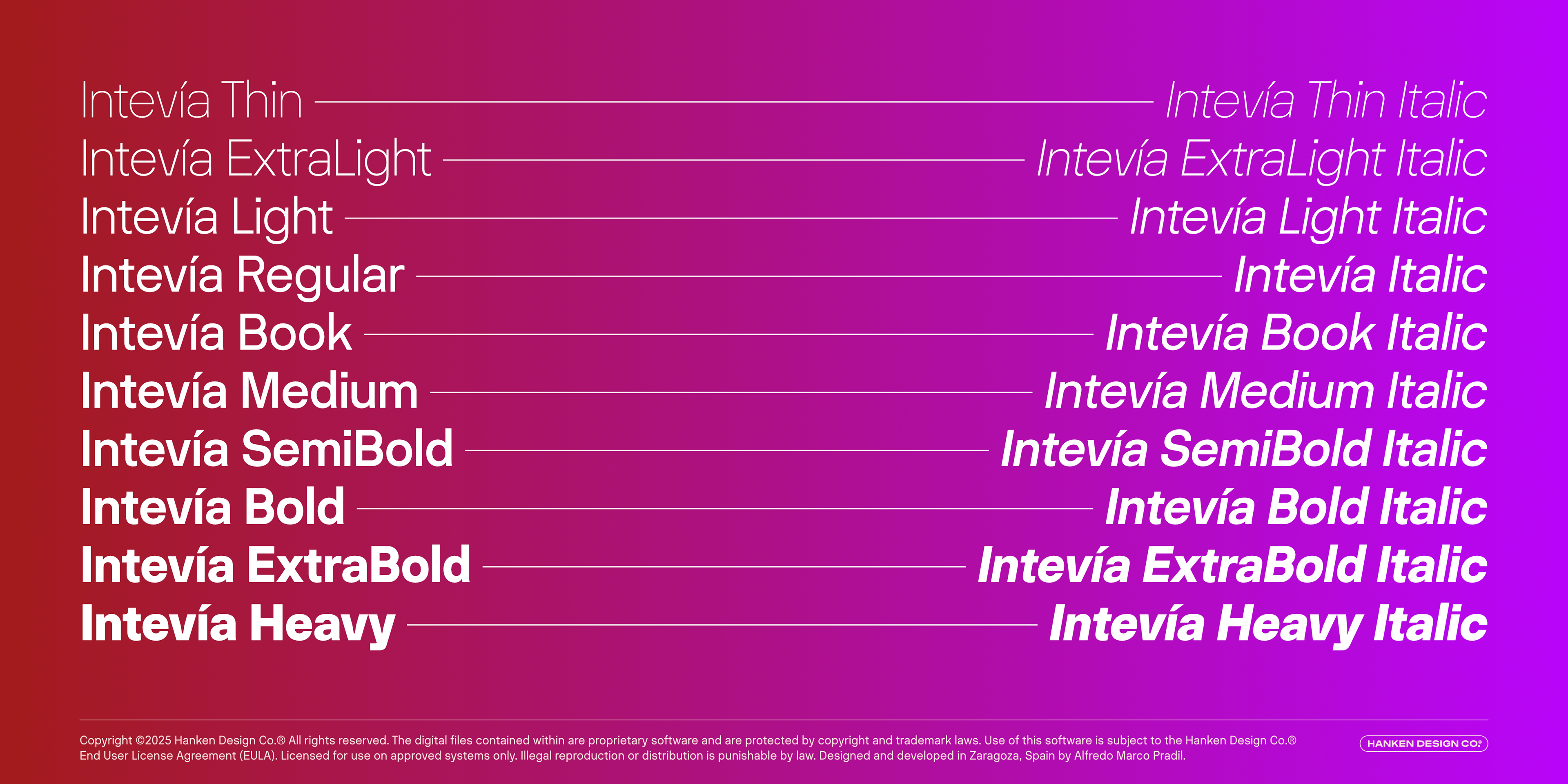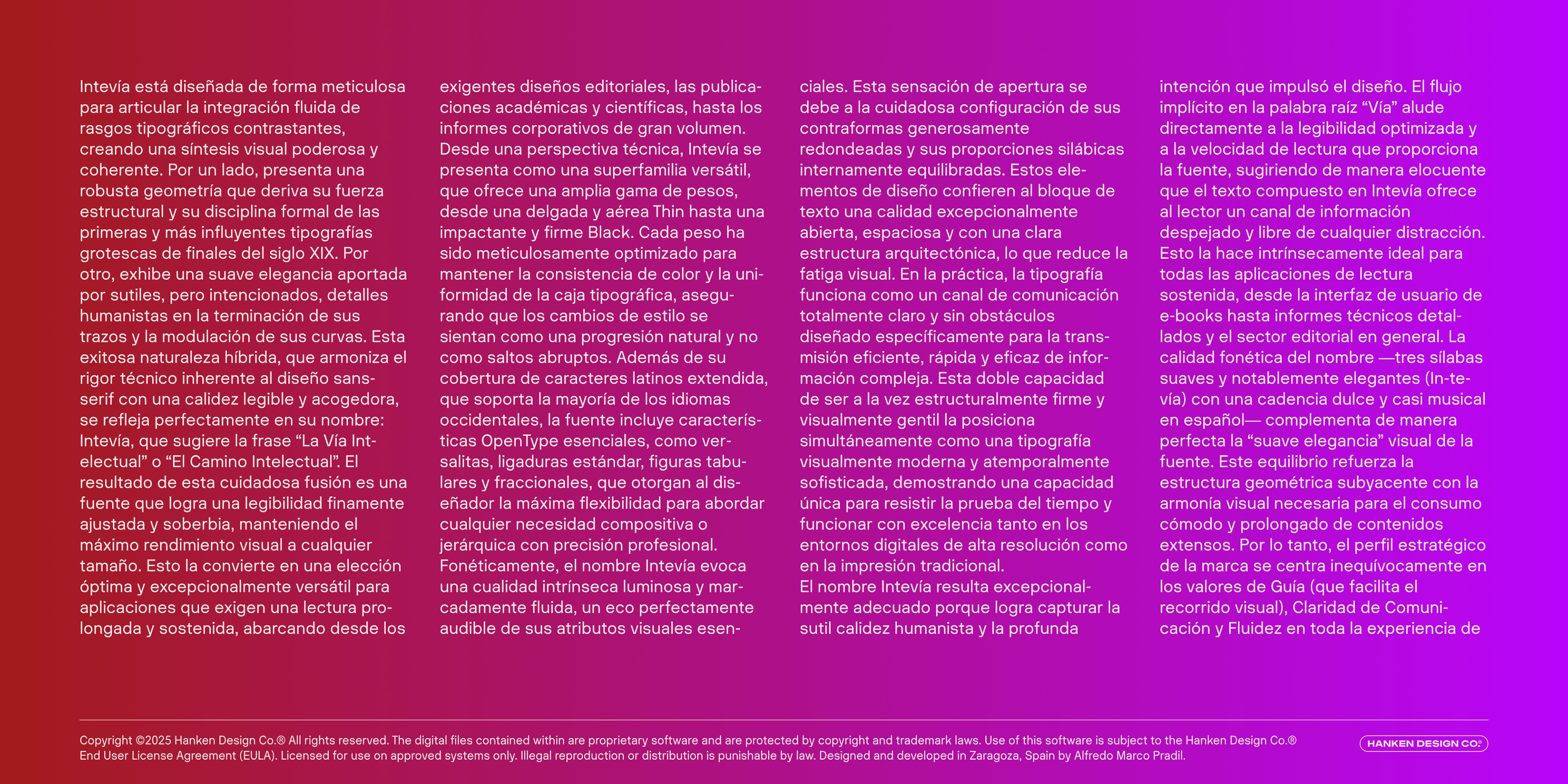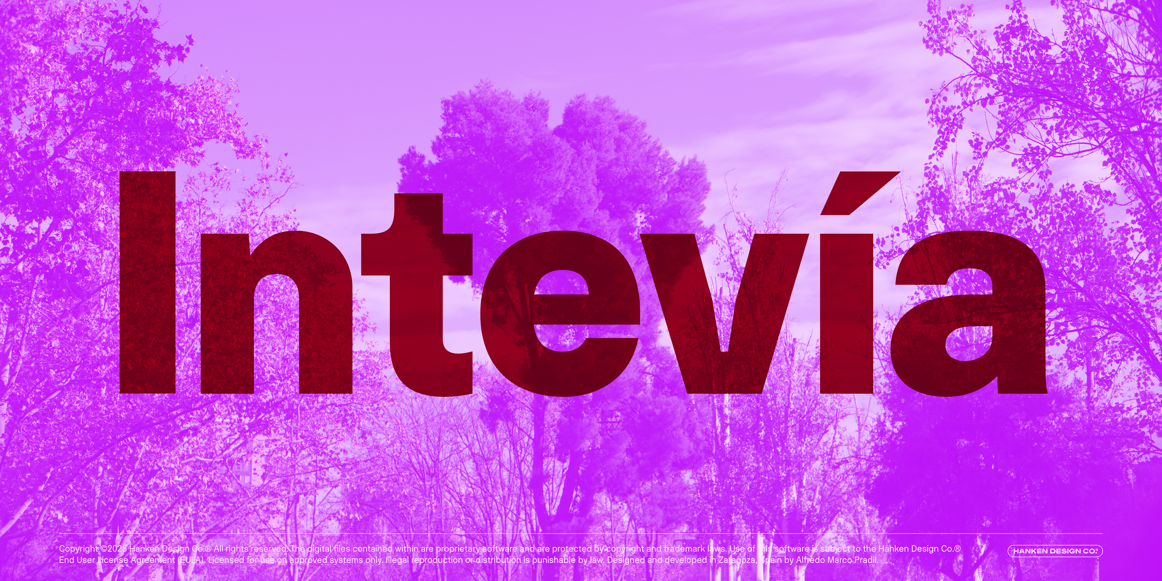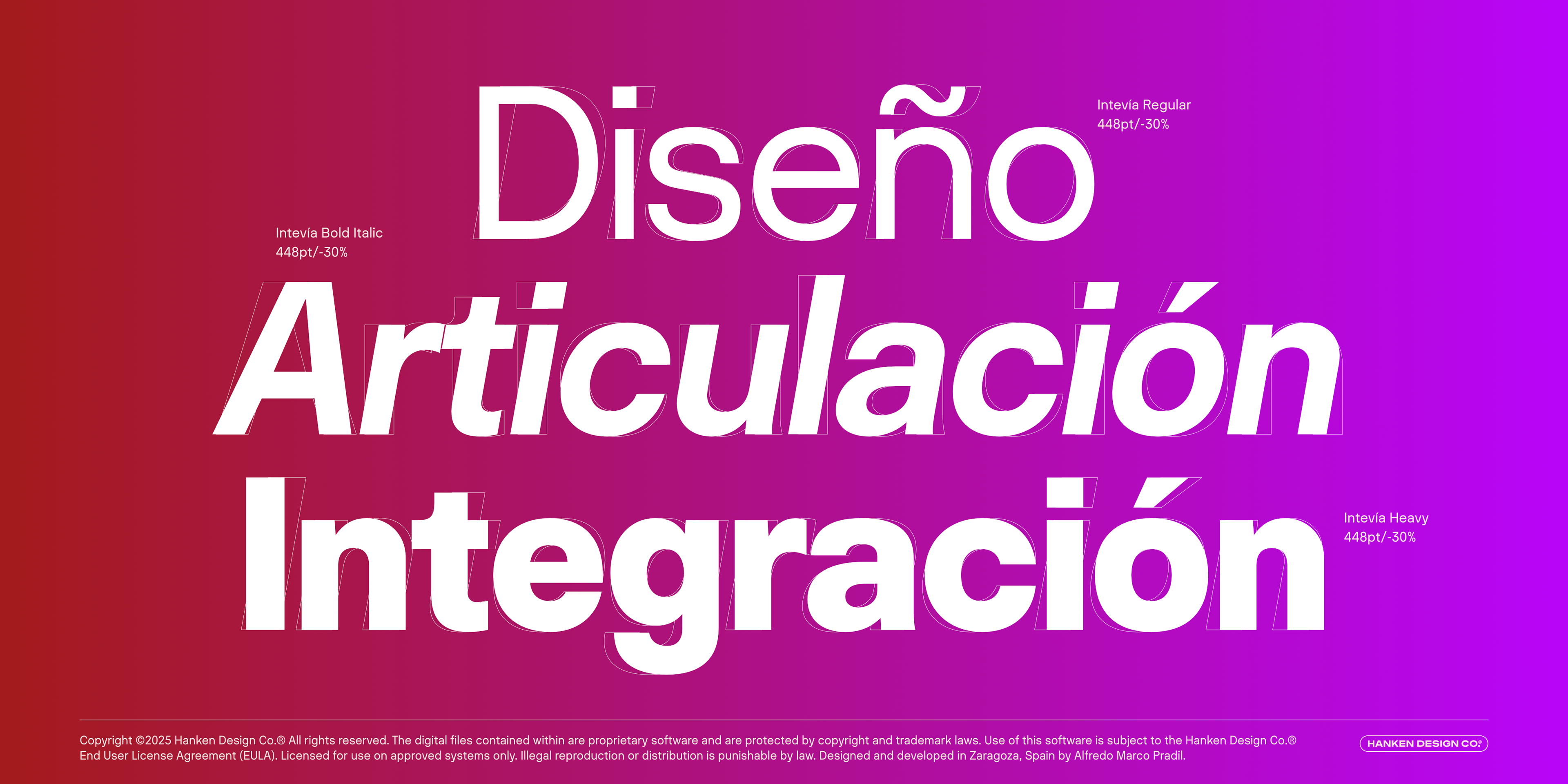 Intevía está diseñada de forma meticulosa para articular la integración fluida de rasgos tipográficos contrastantes, creando una síntesis visual poderosa y coherente. Por un lado, presenta una robusta geometría que deriva su fuerza estructural y su disciplina formal de las primeras y más influyentes tipografías grotescas de finales del siglo XIX. Por otro, exhibe una suave elegancia aportada por sutiles, pero intencionados, detalles humanistas en la terminación de sus trazos y la modulación de sus curvas. Esta exitosa naturaleza híbrida, que armoniza el rigor técnico inherente al diseño sans-serif con una calidez legible y acogedora, se refleja perfectamente en su nombre: Intevía, que sugiere la frase “La Vía Intelectual” o “El Camino Intelectual”.
