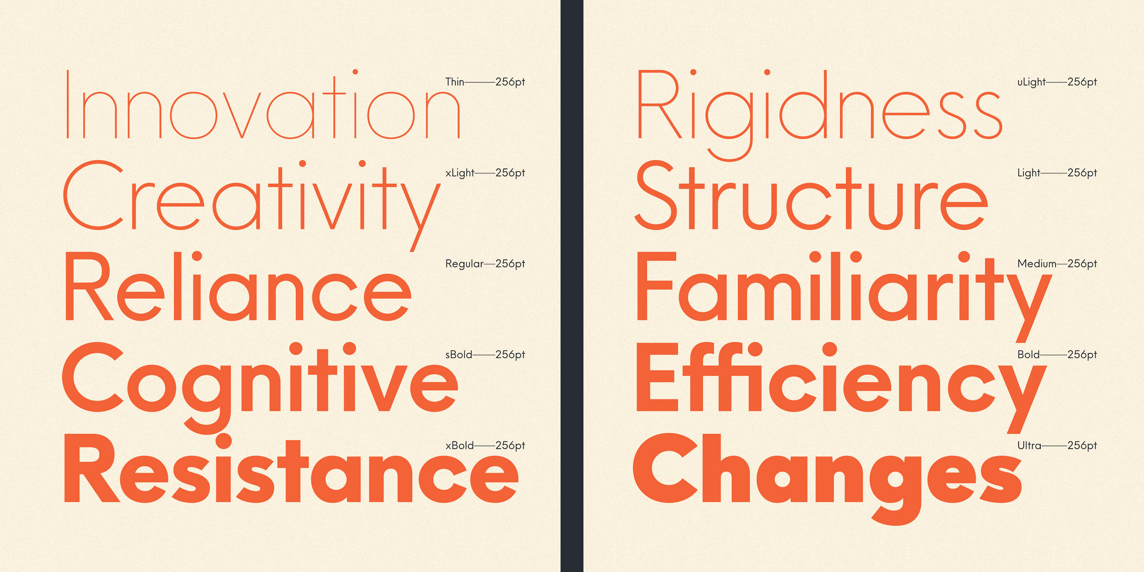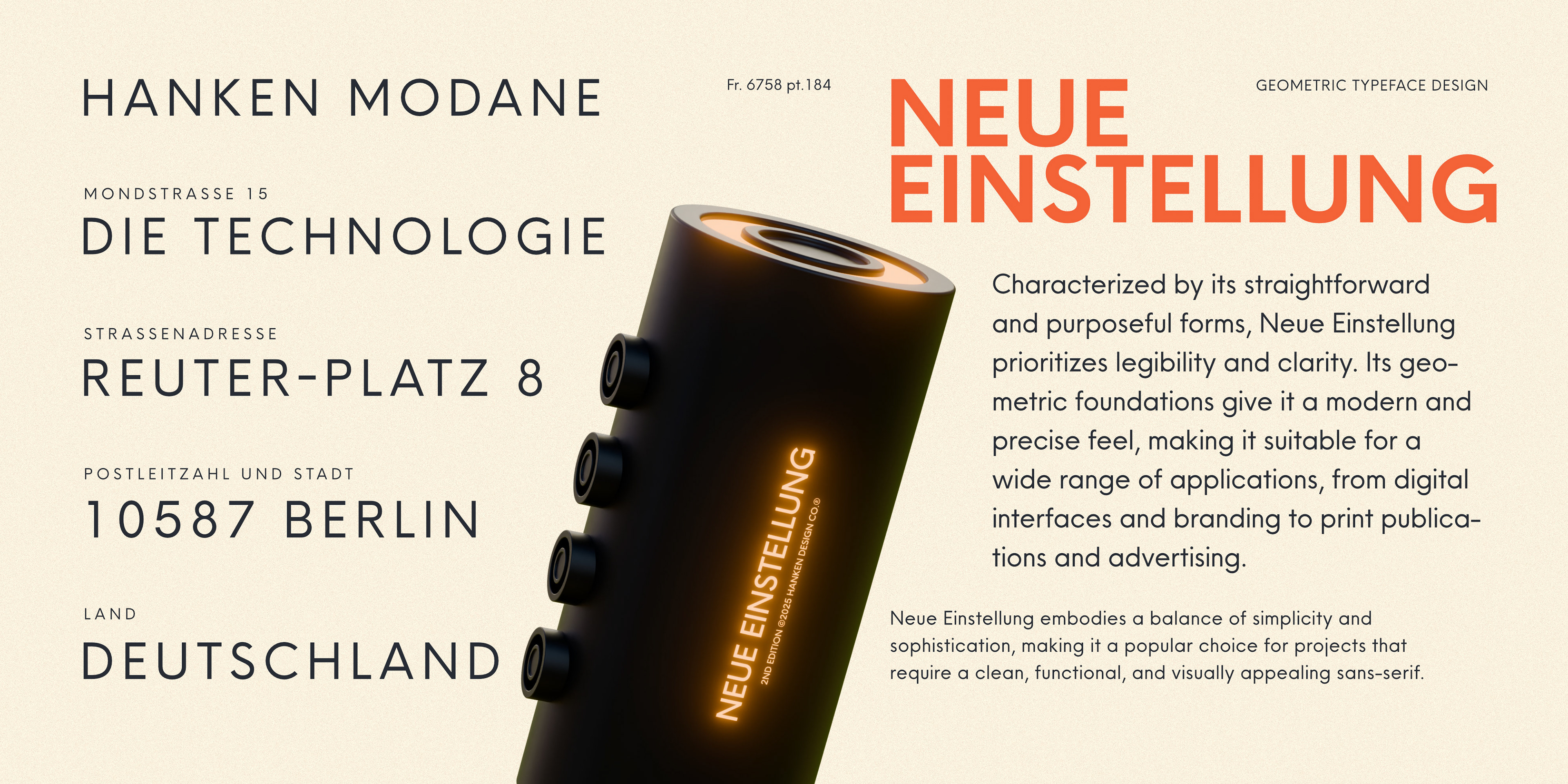 Neue Einstellung is a geometric typeface with simplicity and straightforwardness that stands out in small or large scale applications. Inspired by the Einstellung Effect, it embodies rigidity in the way it looks and the way it performs. It has been used by contemporary brands all over the world due to the clean and minimalistic feel that it promotes.