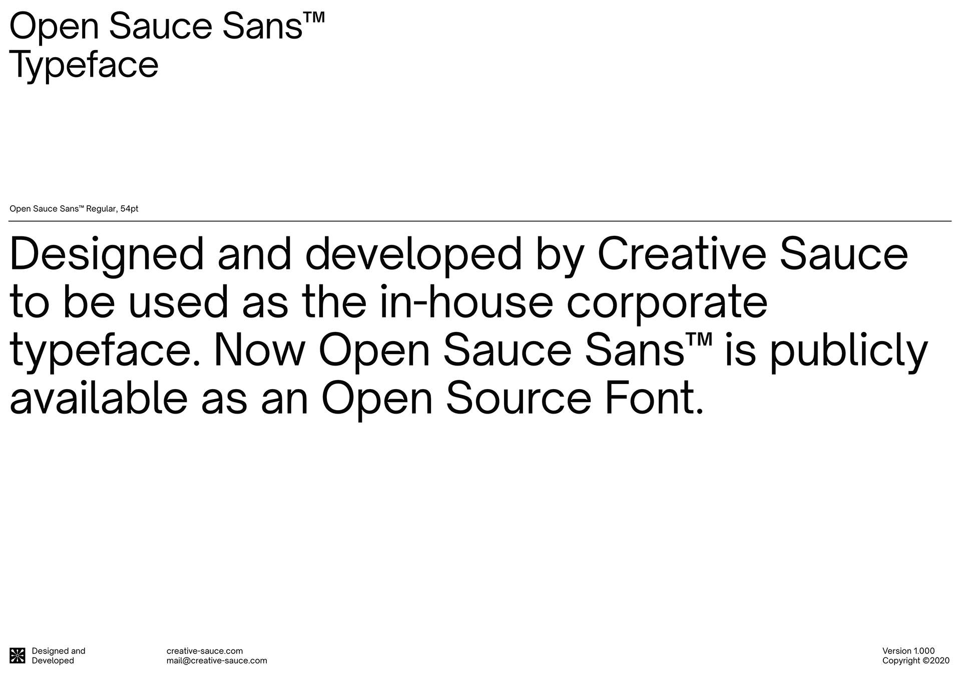 Open Sauce Sans™/Open Sauce One™/Open Sauce Two™ is a typeface that we developed for our internal type system. It is a compact typeface that is optimised for better viewing small text on screen and print. Open Sauce Sans fonts are under the SIL Open Font License and is going to be actively developed, improved and tested.