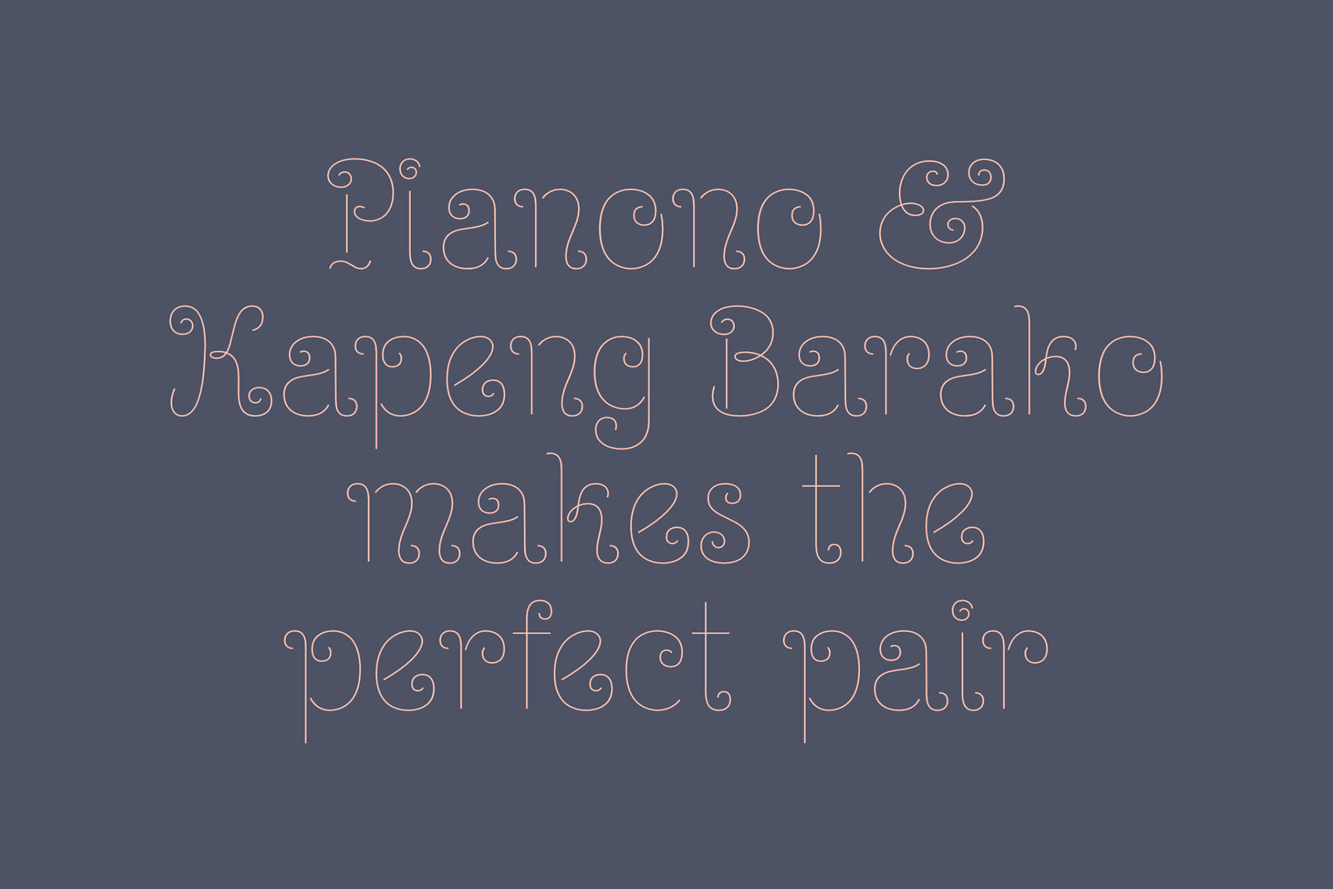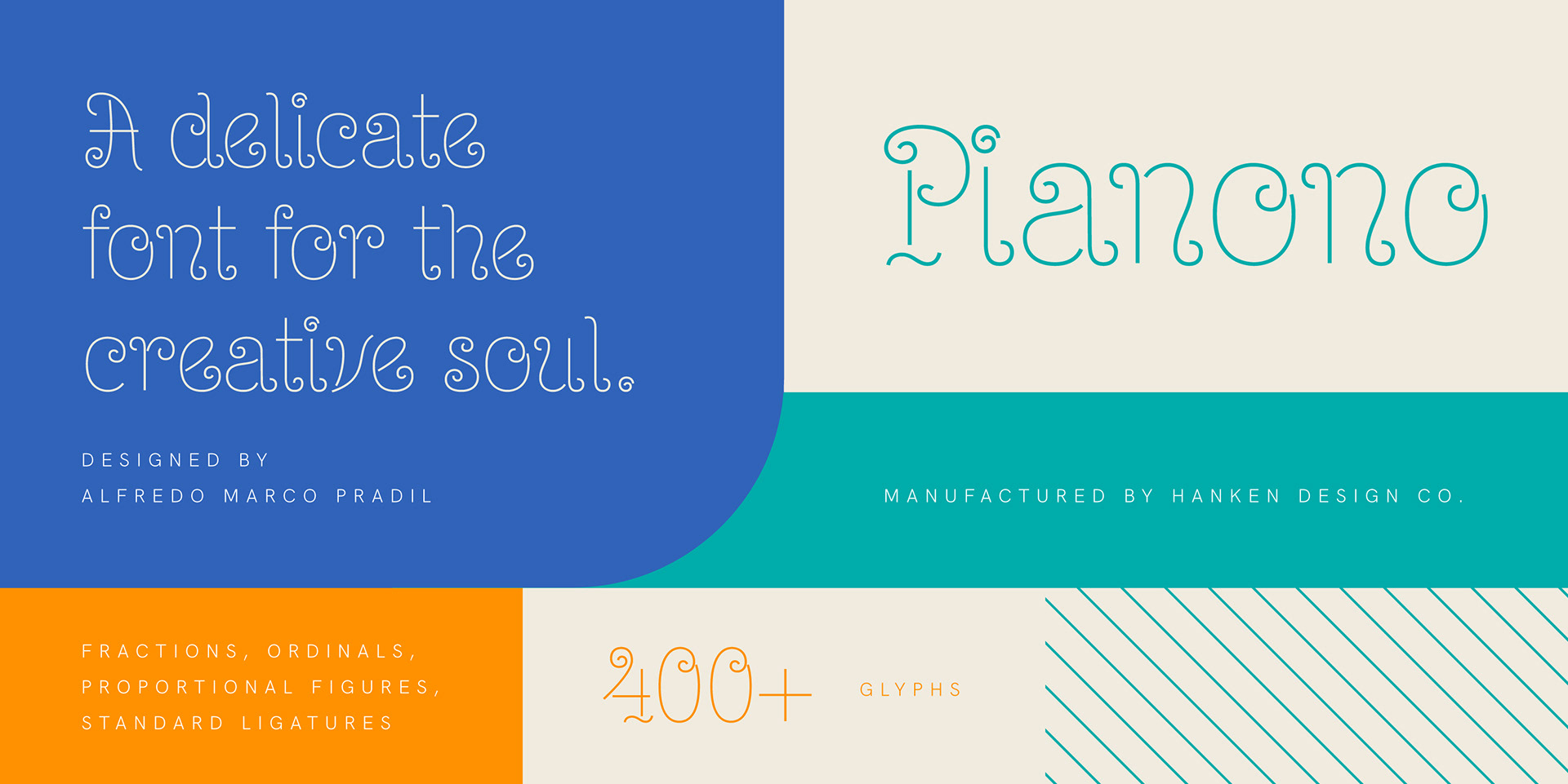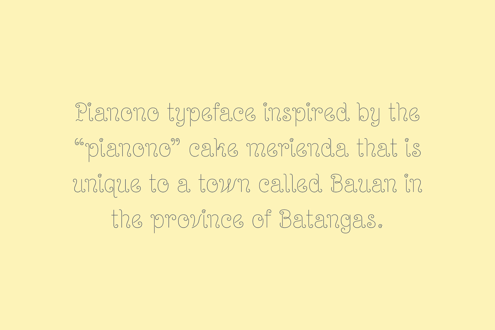 Like the delicacy of the same name, the Pianono is a playfully simple typeface that everyone can enjoy. As relaxing as that first munch of your favorite pillowy cake, your first time writing with this one will give you a fluffy feeling rooted in satisfaction. Aside from its aesthetic appeal, a touch of history lies in each twist and turn. If you worry that the curls are too extravagant for your text, this font takes pride in its rusticity, just like the dessert after which it is designed. Although it abounds in spiral embellishments, the letters retain their characteristics, making them readily readable in a classier manner! The next time you buy a slice for yourself or your family to devour, look closely into its sides where the spirals are seemingly imprinted. Compare it with your previous Pianono, and you will notice that the curls of booming flavors do not always look the same. Remarkable, right? That is precisely the reason why you will never get bored of this typeface! If you inspect the twists of every letter, number, and symbol, you will find that these are all unique! Some curls are only partly circling, some are larger while others are tighter, and some are mere curves. Additionally, you can always play with the colors if you want your text to resemble a different taste. You can even create your own: strawberry, zesty orange, name it. That is the beauty of the Pianono! Its versatility is in your creativity!