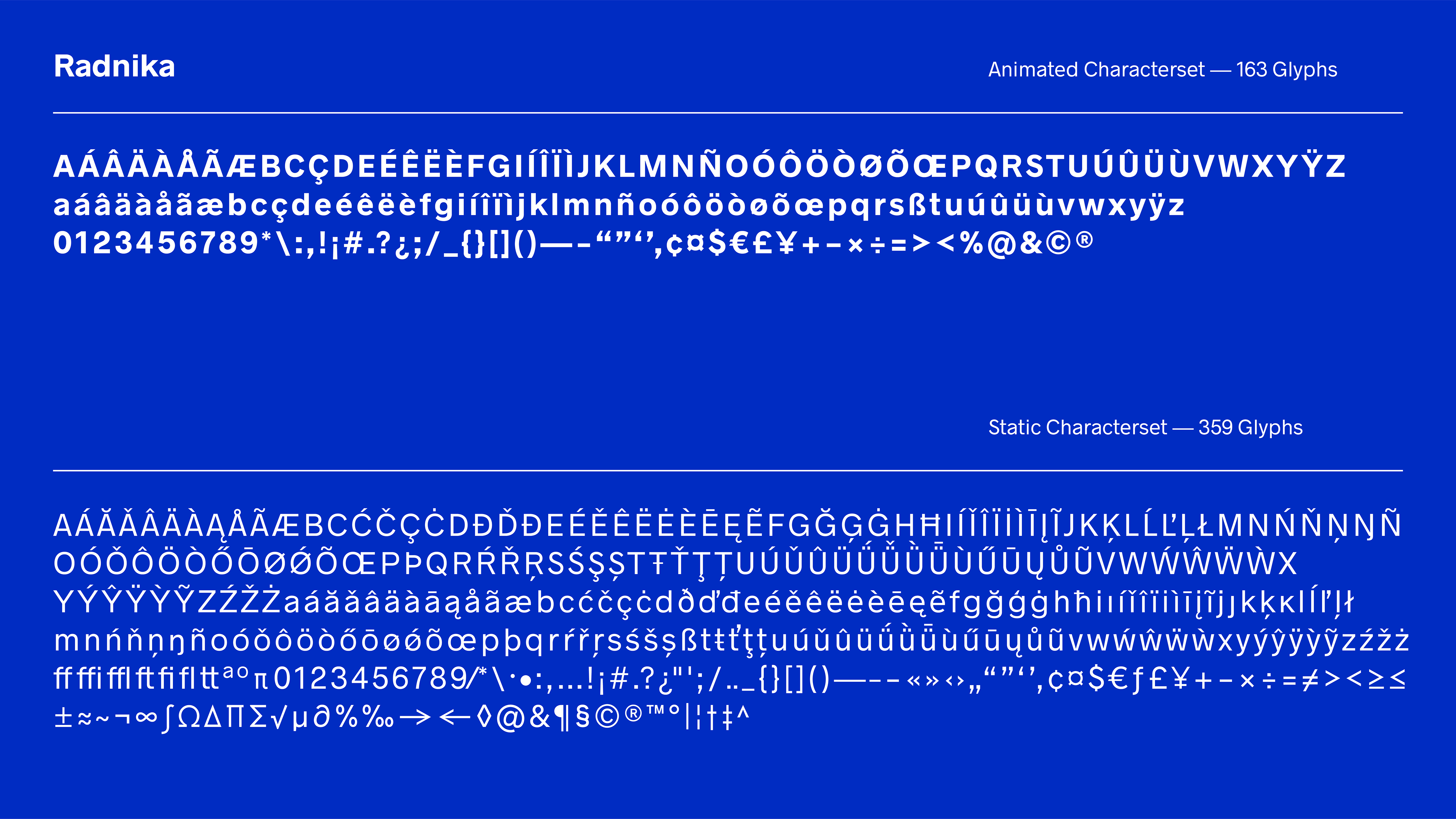 Language support includes Basic Latin, Western European, Euro, Baltic, Turkish, Central European, Romanian, Pan African Latin, and Pinyin, and Radnika features both discretionary and standard ligatures to complete the package.