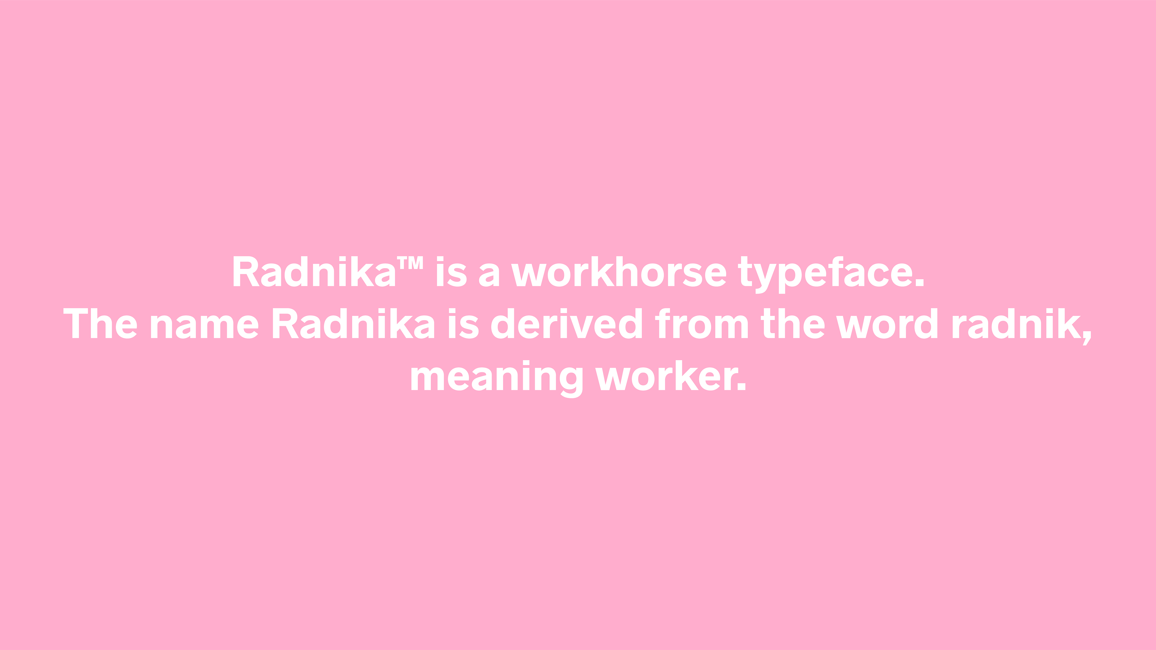 Radnika is a multi-purpose sans serif typeface that bridges the gap between the strong expressive typefaces of the 19th century and the finer, rather stern, typefaces of the 20th century.