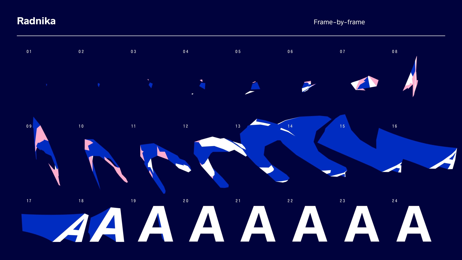 The animated version is made from the Bold weight. A mix of 3D and 2D frame-by-frame animation was used to create a distinct low-poly look with lots of energy.