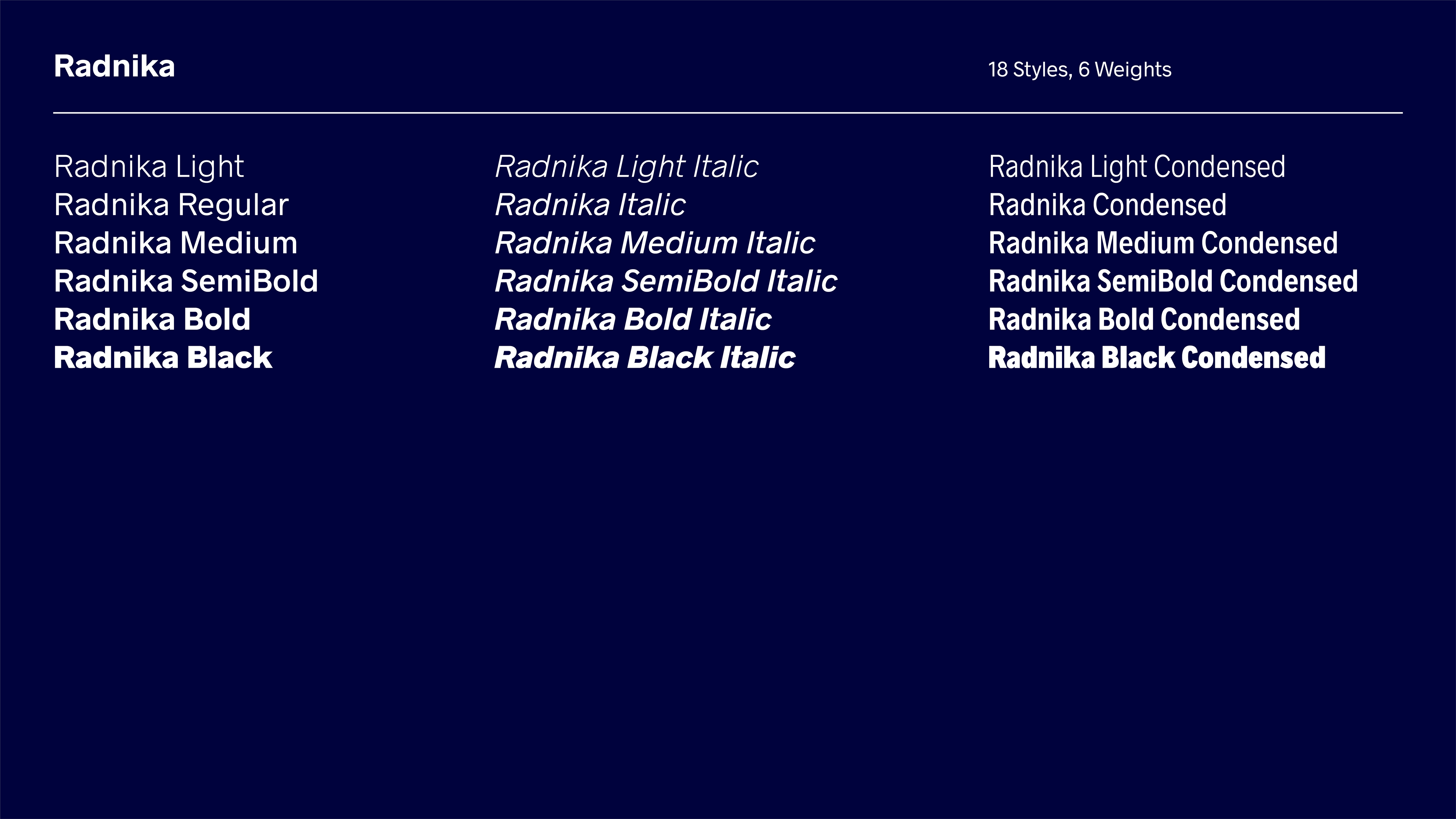 Light, Regular, Medium, SemiBold, Bold, and Black each have corresponding Condensed and Italic versions available for a total of 18 styles in six weights. Radnika is a strongly built, versatile font family that's well suited for mobile applications, web content, editorials, advertising, branding, identity, and corporate communications, among countless other design projects.