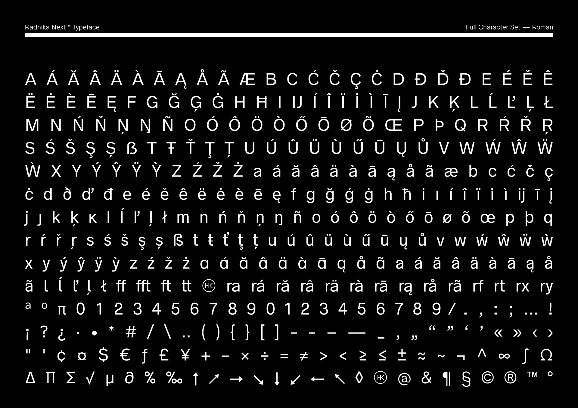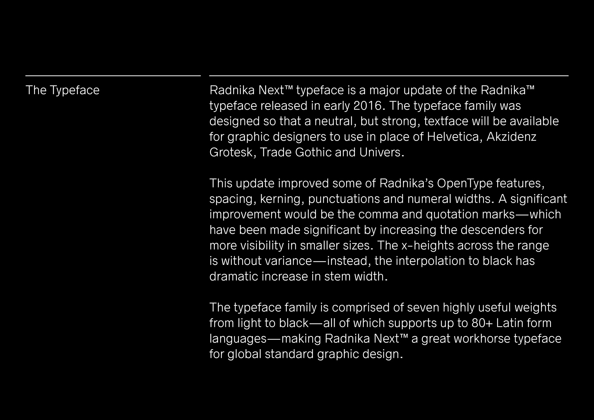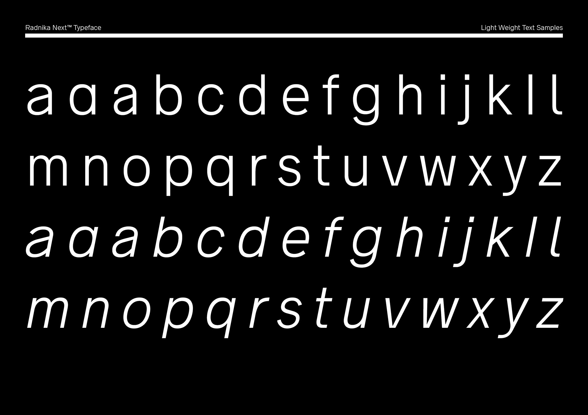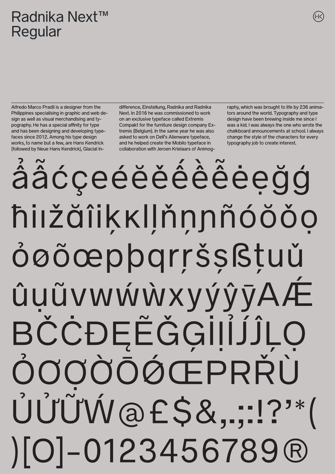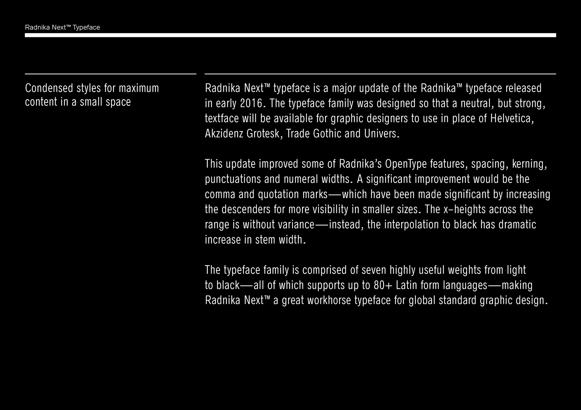 Radnika™ Next enhances the geometry, kerning, spacing and ligature handling of the Radnika™ typeface. Radnika™ Next is a multi-purpose sans serif typeface that bridges the gap between the strong expressive typefaces of the 19th century and the finer, rather stern, typefaces of the 20th century.