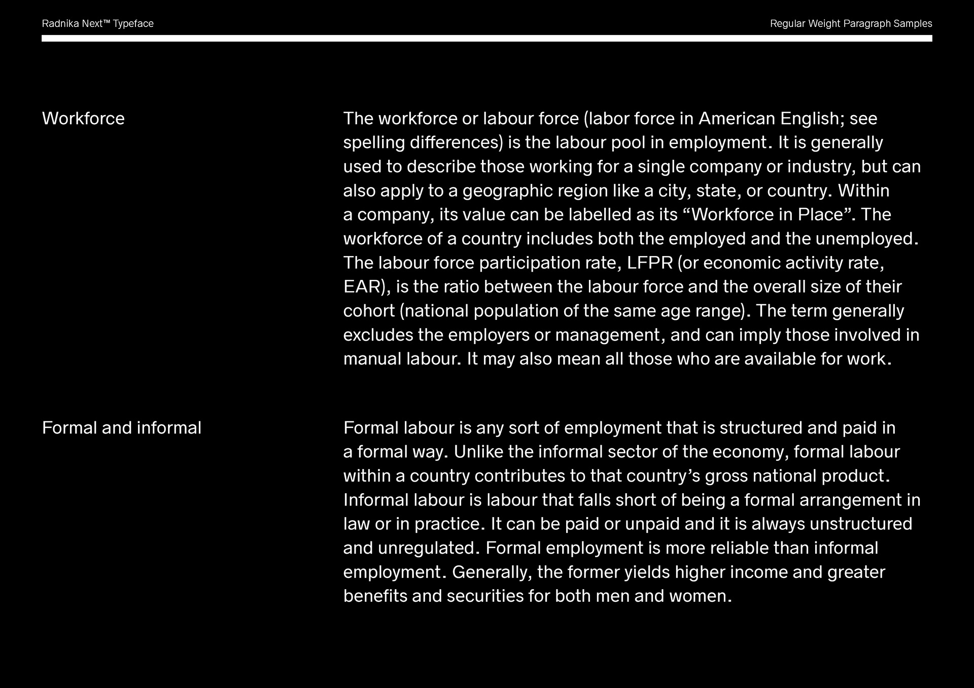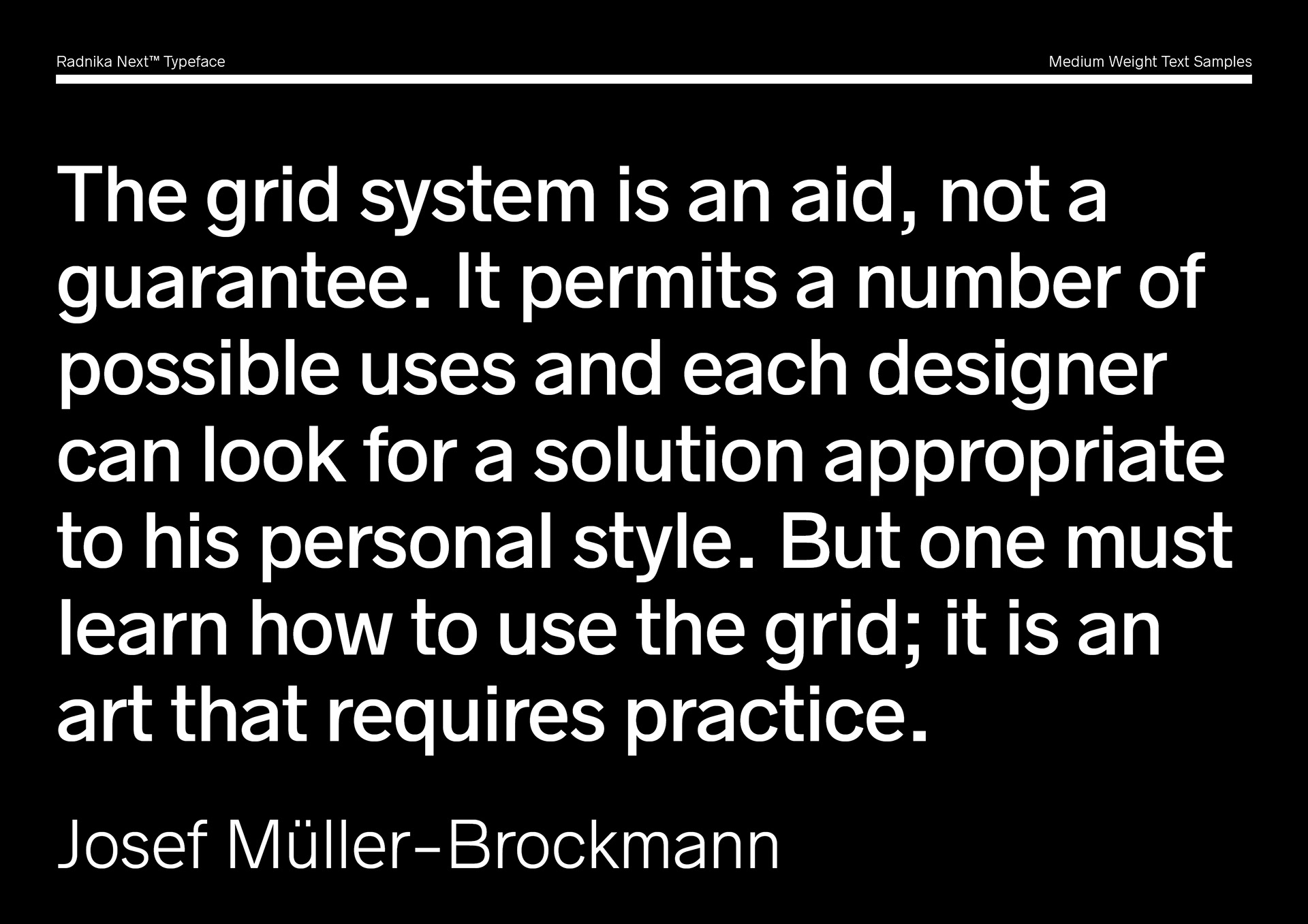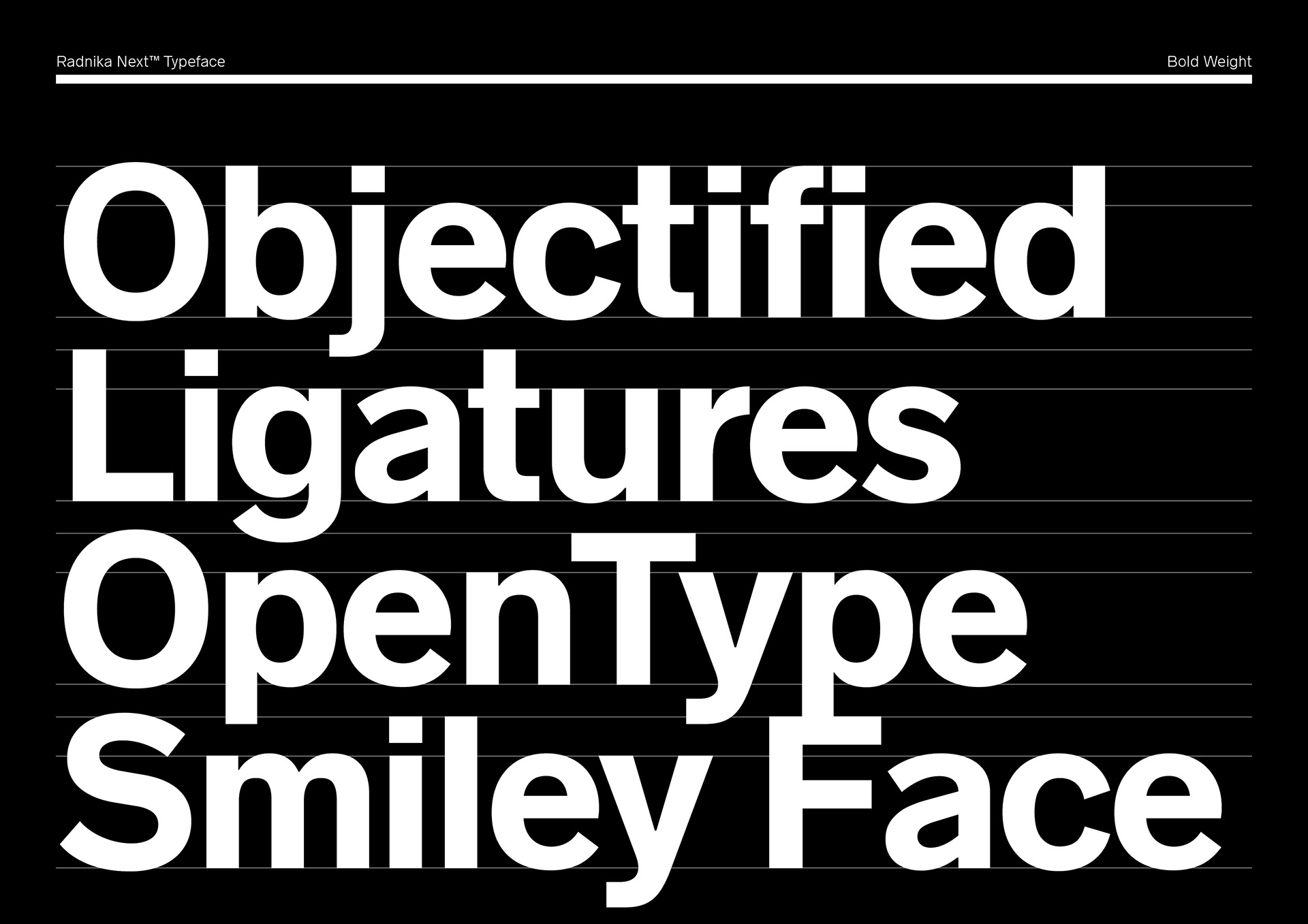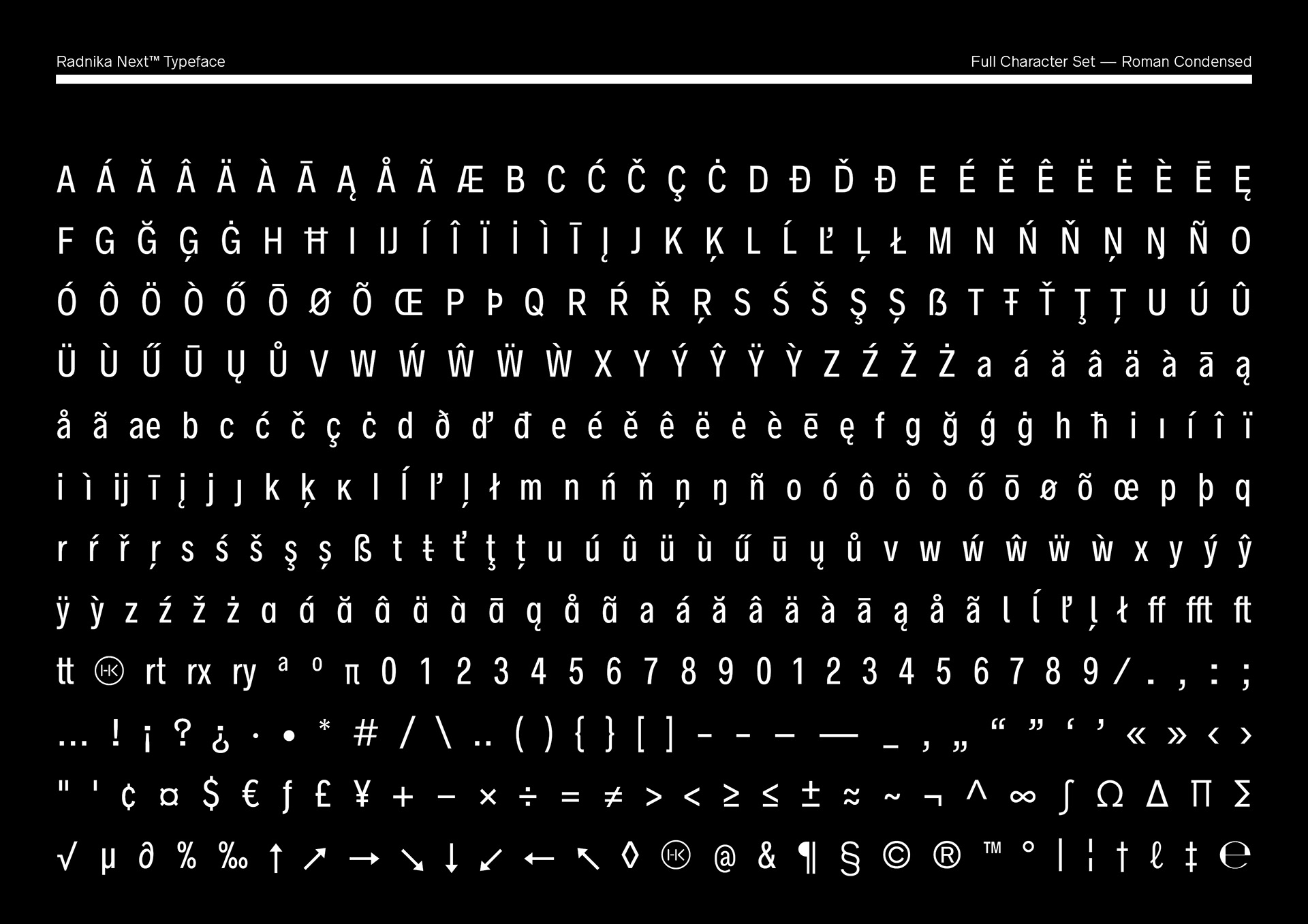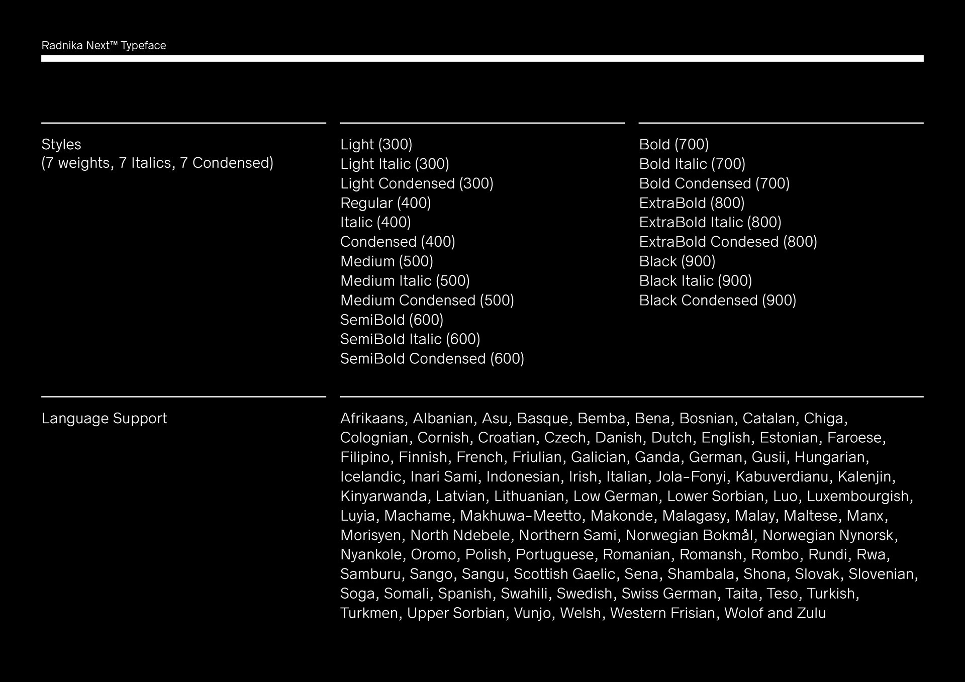 Radnika™ Next enhances the geometry, kerning, spacing and ligature handling of the Radnika™ typeface. Radnika™ Next is a multi-purpose sans serif typeface that bridges the gap between the strong expressive typefaces of the 19th century and the finer, rather stern, typefaces of the 20th century.