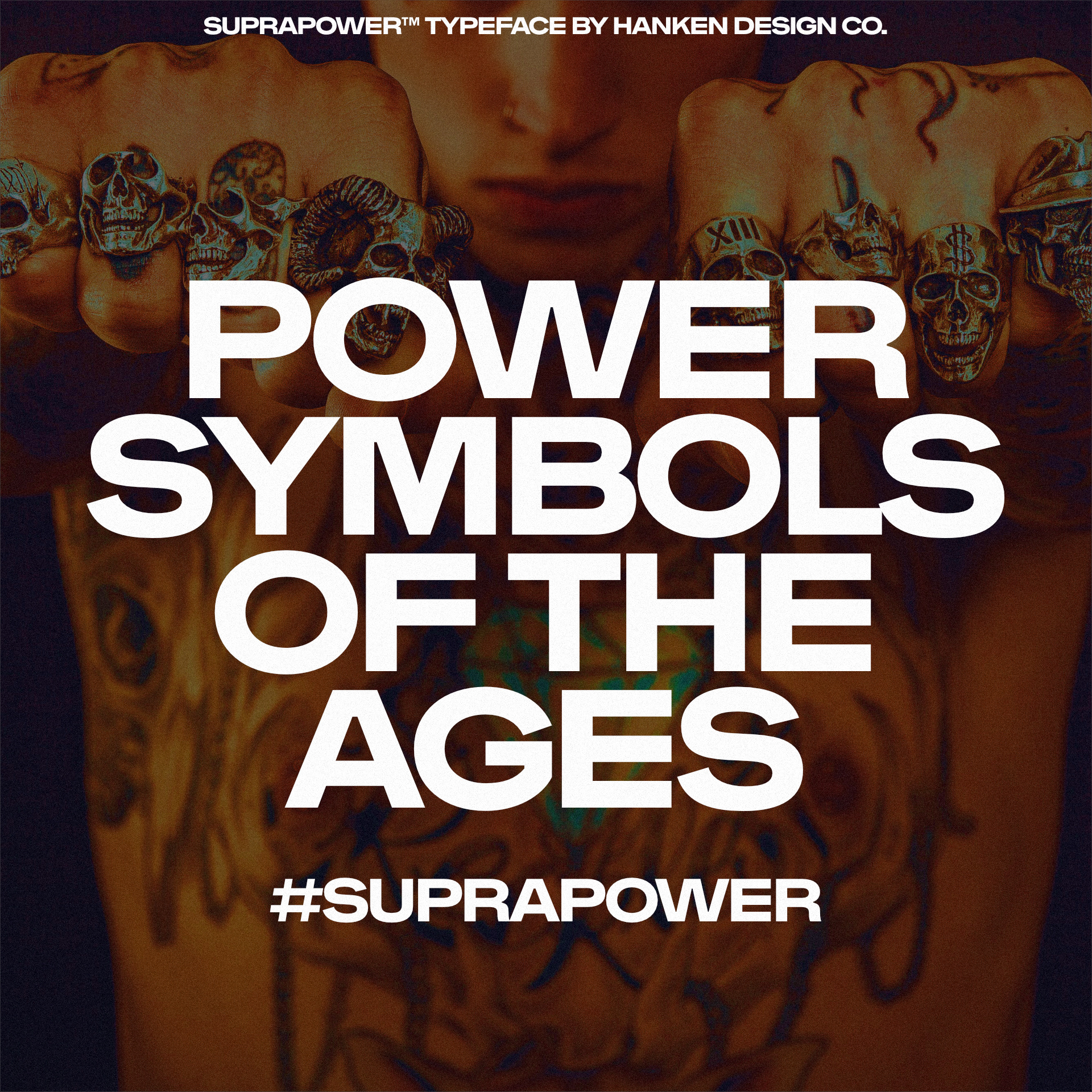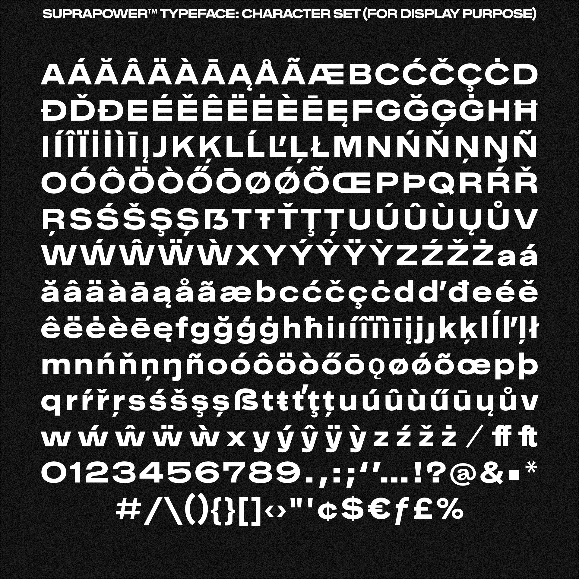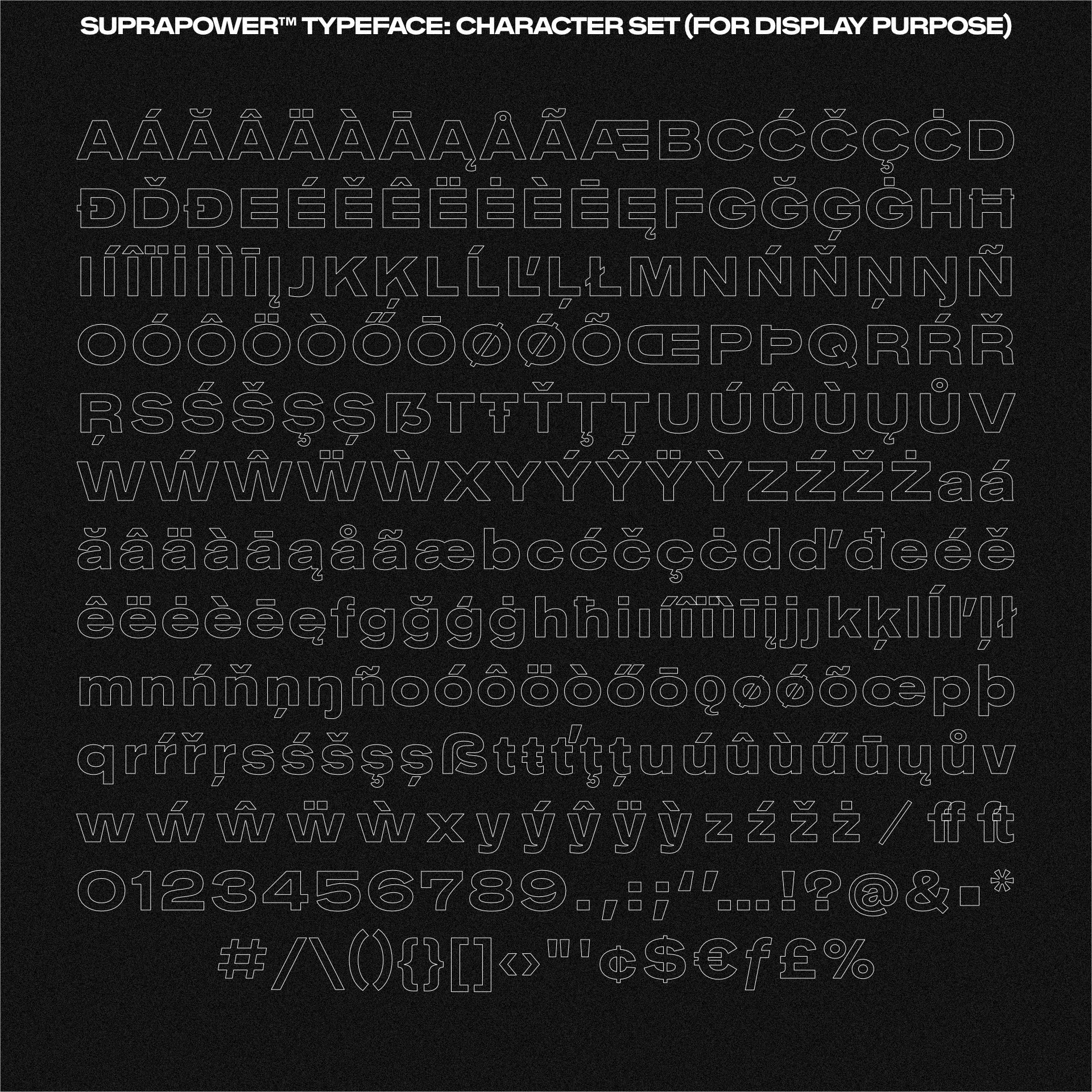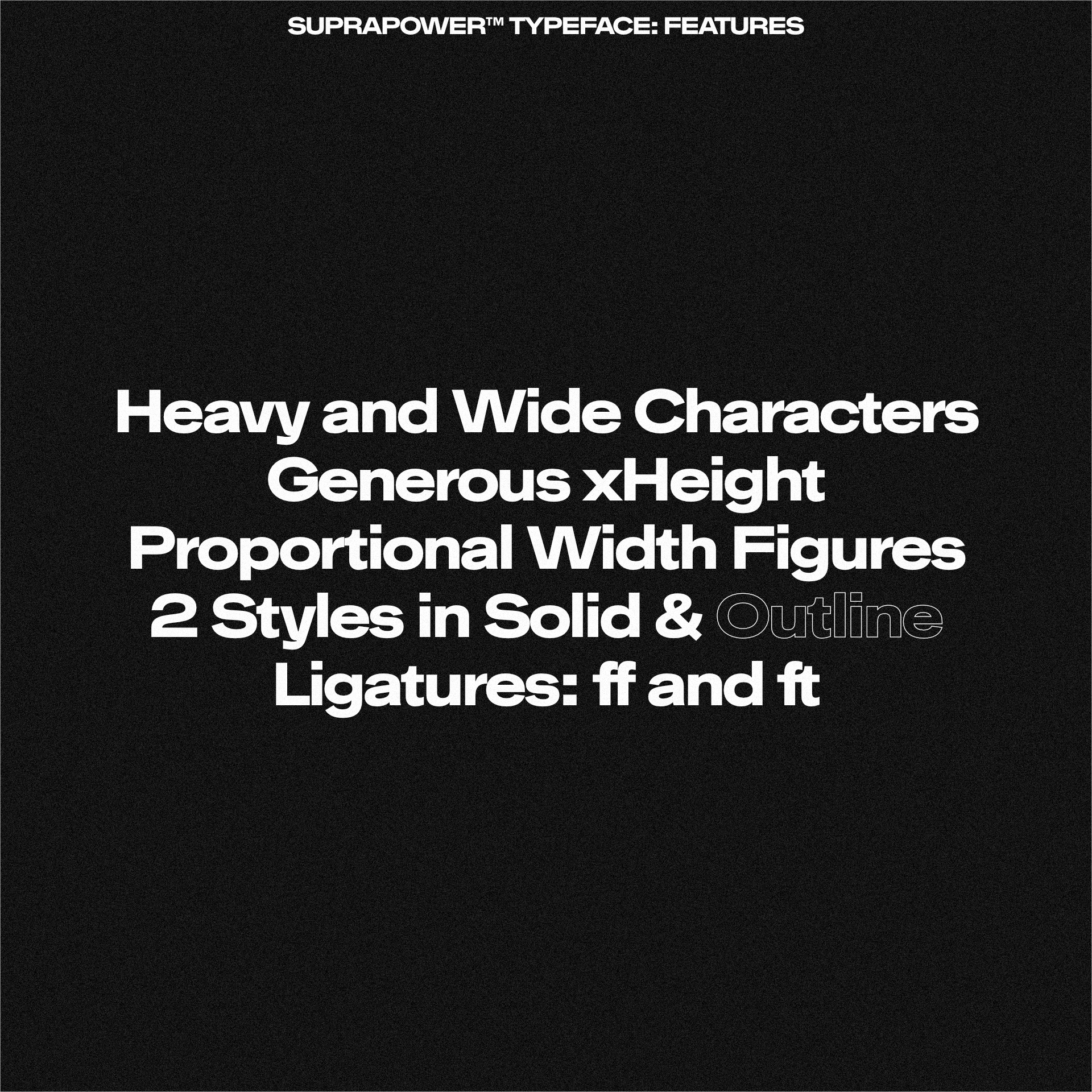 Suprapower™ is a wide typeface for poster, packaging, headline and titles. It has only two styles: heavy wide solid and heavy wide outline.